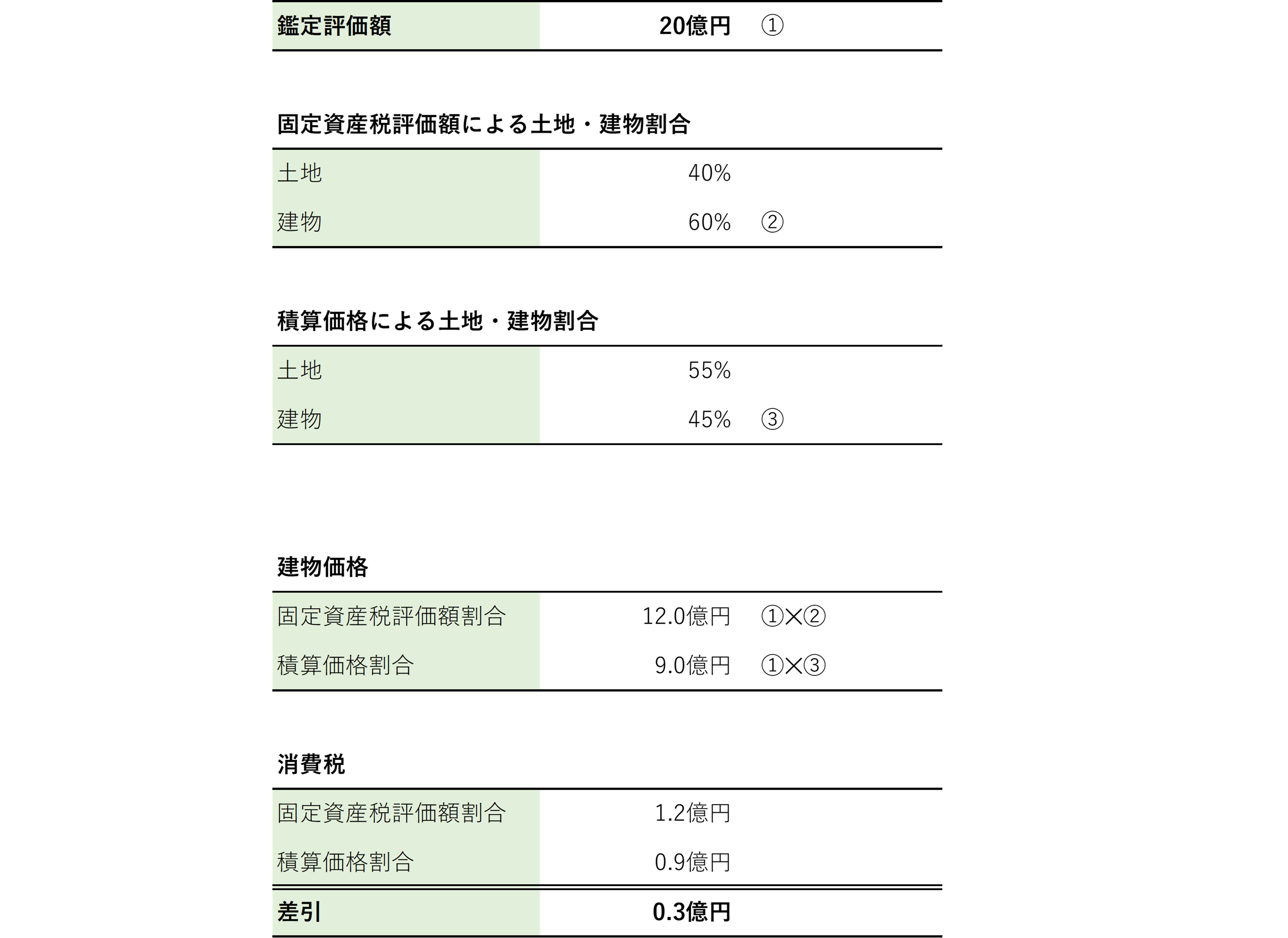 ここから、鑑定評価による消費税と固定資産税評価額による消費税を求めると、固定資産税評価額割合による消費税は1.2億円、鑑定評価(積算価格割合)による消費税は、0.9億円となり、その差は0.3億円、3千万円です。